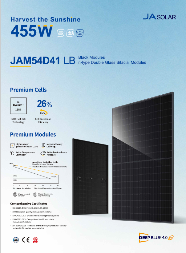 Das JA Solar JAM54D41 LB 450W ist ein modernes n-Typ Doppelglas Bifacial Solarmodul mit höchster Effizienz und langlebiger Performance. Dank innovativer n-Typ Bycium+ Zelltechnologie und MBB-Half-Cell-Technik überzeugt das Modul mit besonders geringer Degradation und stabiler Leistung über Jahrzehnte.