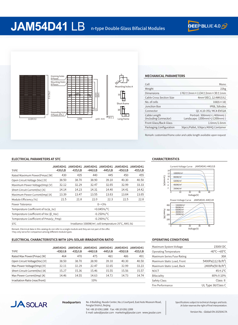Das JA Solar JAM54D41 LB 450W ist ein modernes n-Typ Doppelglas Bifacial Solarmodul mit höchster Effizienz und langlebiger Performance. Dank innovativer n-Typ Bycium+ Zelltechnologie und MBB-Half-Cell-Technik überzeugt das Modul mit besonders geringer Degradation und stabiler Leistung über Jahrzehnte.